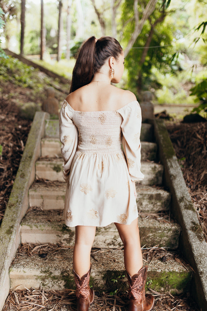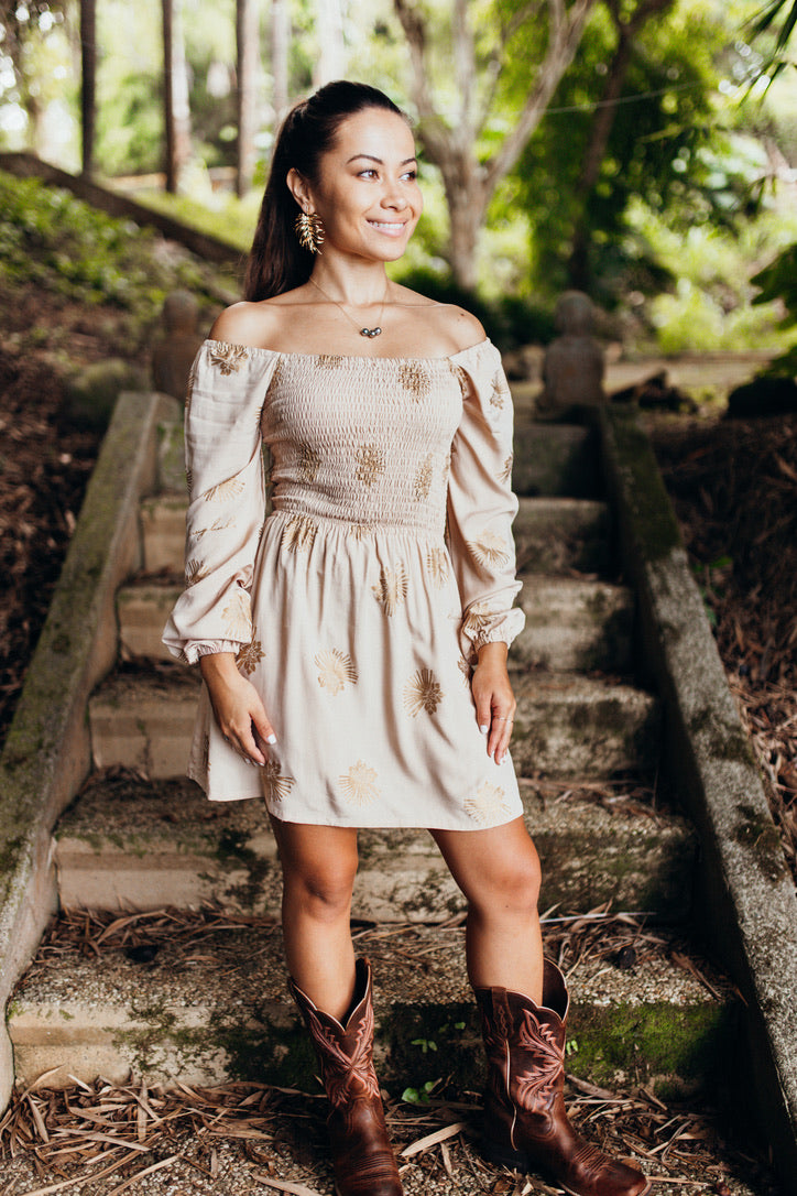 Our Kaiana dress is the epitome of sweet, effortless style. This mini dress flaunts the must-have baby doll silhouette with a flattering ruched bust, breezy flared skirt, and soft, kind sleeves for added elegance. Crafted in our signature Lehua print, it's timeless piece for every occasion.